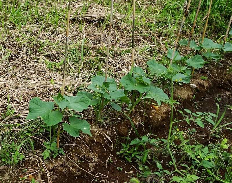 同じ種を蒔いたのに、畝の場所によって育ち方が違う。土の栄養状態かな