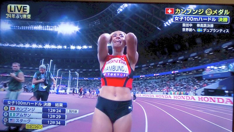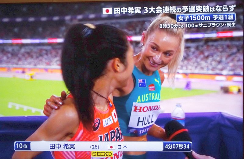 かみさんのご贔屓はオーストラリアのHull(女子1500m。発音が「ハル」なのか「フル/フール」なのかよく分からない。TBSでは「フール」と言っている)やスイスのカンブンジ姉妹(姉のMujinga Kambundjiは短距離、妹のDitaji Kambundjiは今大会では100mHに出場し、本日予選通過)。なぜご贔屓なのかはいまひとつ分からない。