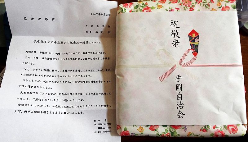 自治会から「敬老の日」のお祝いというのをいただいた。70歳になるともらえるらしい。