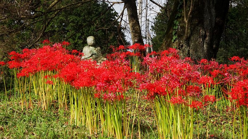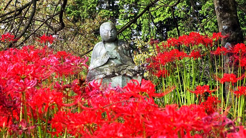 曼珠沙華地蔵。他の場所だと枯れてしまっているのが多いのだけれど、ここはまだ辛うじて残っていた。