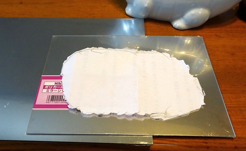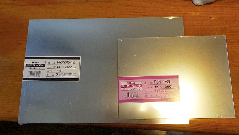 鏡面板が届いた。大きいほうは塩ビで2mm厚。小さいほうはポリカで1mm厚。ポリカのほうを使うことにした。