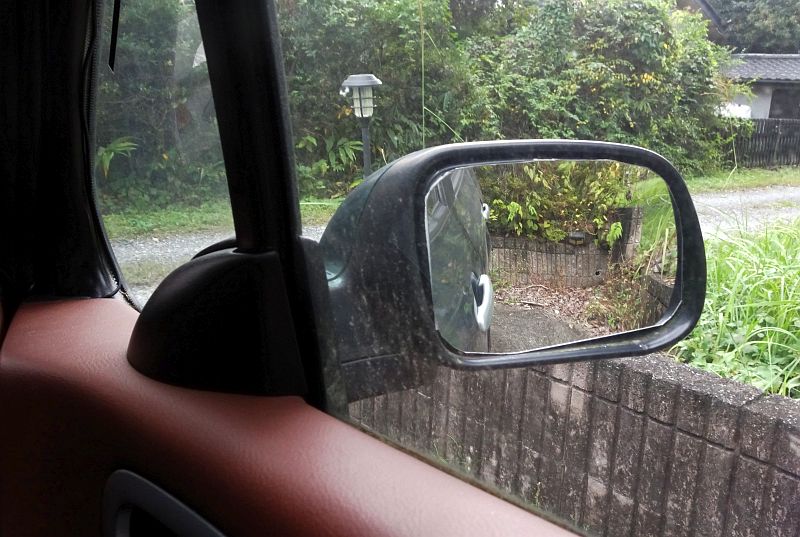 曲がってはいけない前方に折れ曲がり、中のミラー部分が外れてベロ~ンと垂れ下がっている。グイグイと力尽くで填め込み直したのだが、ミラーはしっかり割れてしまっていてどうしようもない。まさに