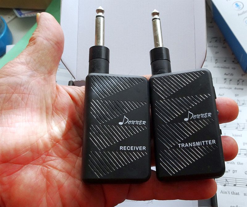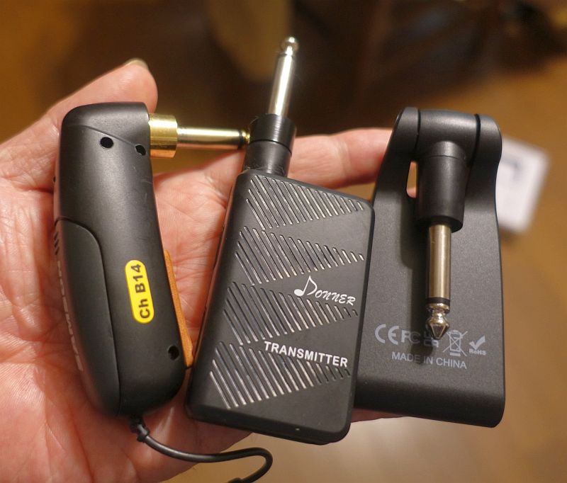 これが次に買って、ほとんど使うことのなかったDonnerの送受信機。送信側と受信側が同じ形で、どちらも単四電池駆動。しばらく使っていなかったら表面がべとべとになってしまい、アルコールで頑張って拭いてなんとかした。今でも音は出ることを確認。