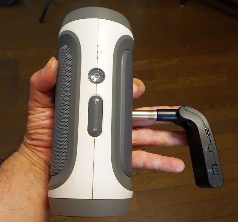 ただ、受信器をJBLのスピーカーにつなぐと、JBL側の入力がミニプラグ用のソケットなので、変換プラグを噛ませてこうなってしまう。まあ、受信側は不細工でも別に問題はないけどね。