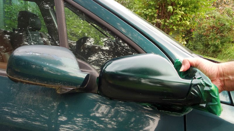 ドアミラーの形に合わせてカットする作業は慎重に進めなければ……