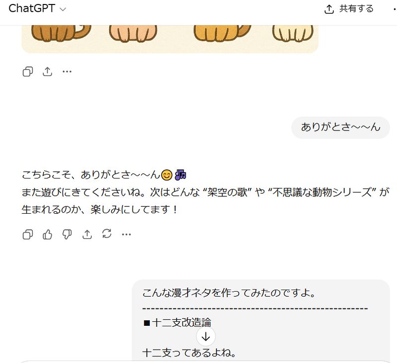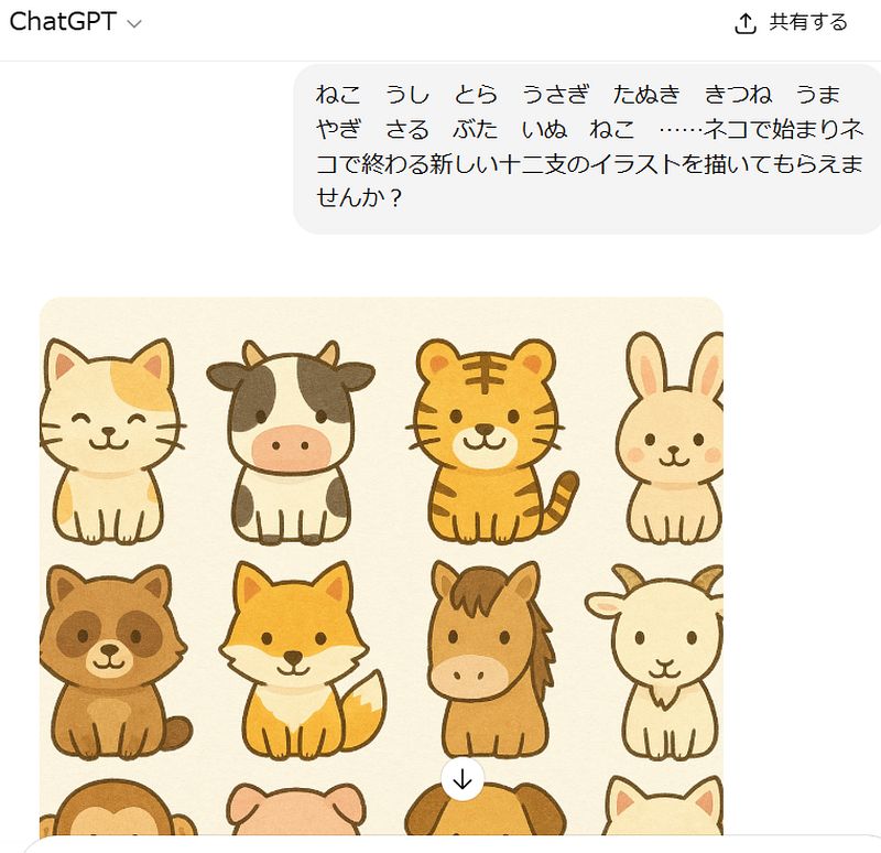 ネタを書き上げて、結構いい出来だと思ったので、日記やFB、noteにUPする際にイラストをつけておきたいと思い、ChatGPTに「ねこ うし とら うさぎ たぬき きつね うま やぎ さる ぶた いぬ ねこ ……ネコで始まりネコで終わる新しい十二支のイラストを描いてもらえませんか?」とお願いして描いてもらったものだ。