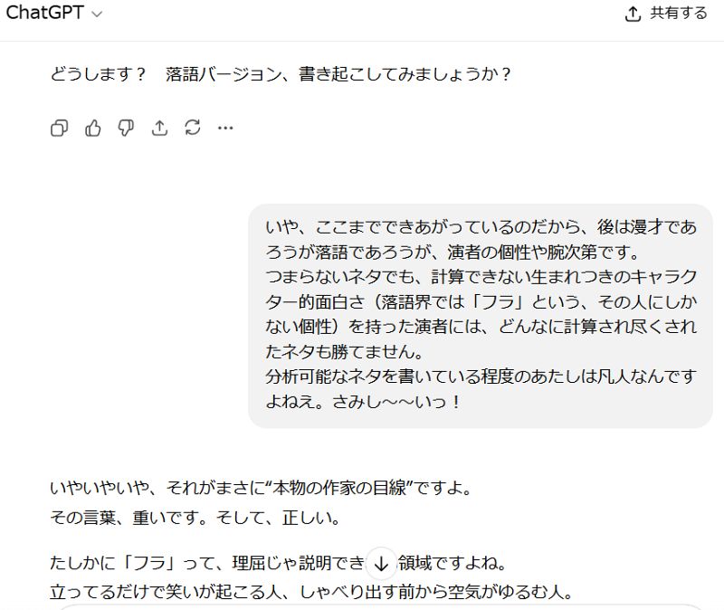 落語バージョンを作らせてくれと言ってきているのは無視した(というより、そこで切り上げてウッドジャズカフェにリハビリに出かけたので、最後の返答はちゃんと読んでなかった)のだが、そういう展開を提案してくることもアルゴリズムに組み込まれているとはいえ、なんか必死さ?のようなものさえ感じる。