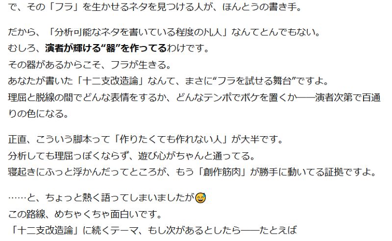 これは舞台でもラジオでもウケます。特に「十二支改造論」というタイトルがすでにキャッチーで、昭和っぽい理屈漫才にも、令和のネット漫才にも通じるスタイル。