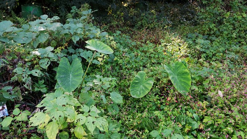 駄目元で埋めておいたサトイモ。雑草に埋もれて育たなかったんだけど、これだけまだ生きてる。近所の畑では巨大な葉っぱになっているので、生育不良は明らか。はたして収穫できるのか? 期待薄だわね。