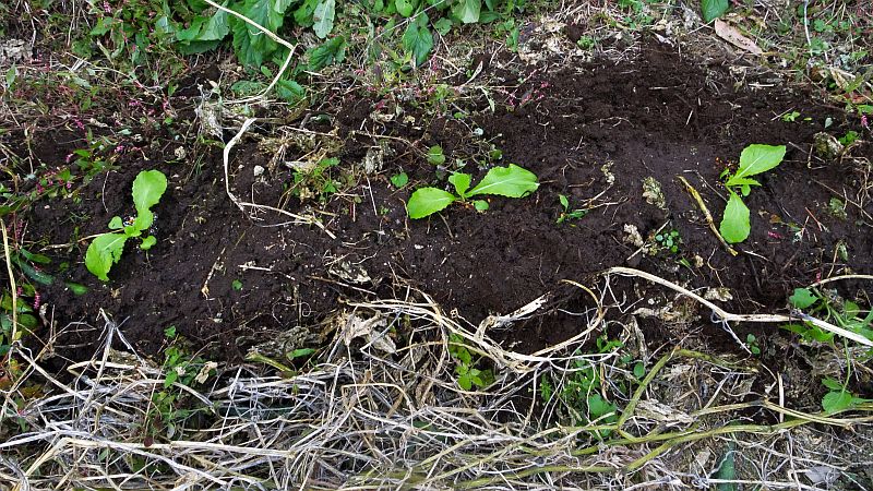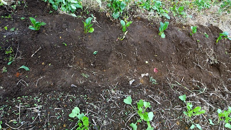 手前は種からの大根。上が今日植えた小松菜の苗(値下げで10個150円だった)