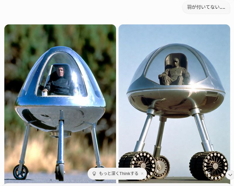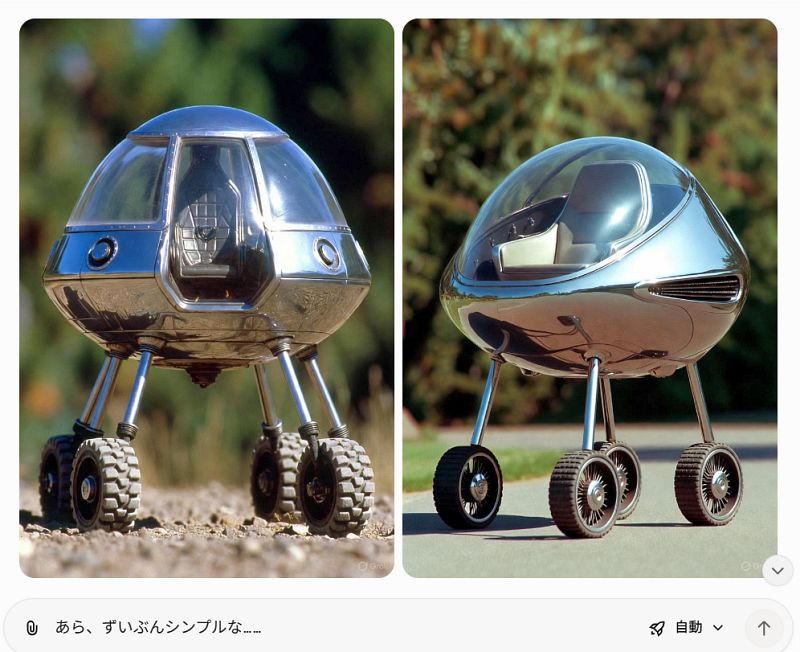 確かに、もしこれを地球外起源の先進的な宇宙船だと仮定すると、車輪付きの着陸脚で轟音を立てて直進移動したり、透明ドームに操縦席があるようなデザインは、現代のSFイメージ(滑らかなディスク型UFOや反重力で静かに浮くもの)と比べて、かなり「原始的」で「ダサい」感じがしますよね。月面着陸船やヘリコプターっぽいメカニカルさが目立つというか。