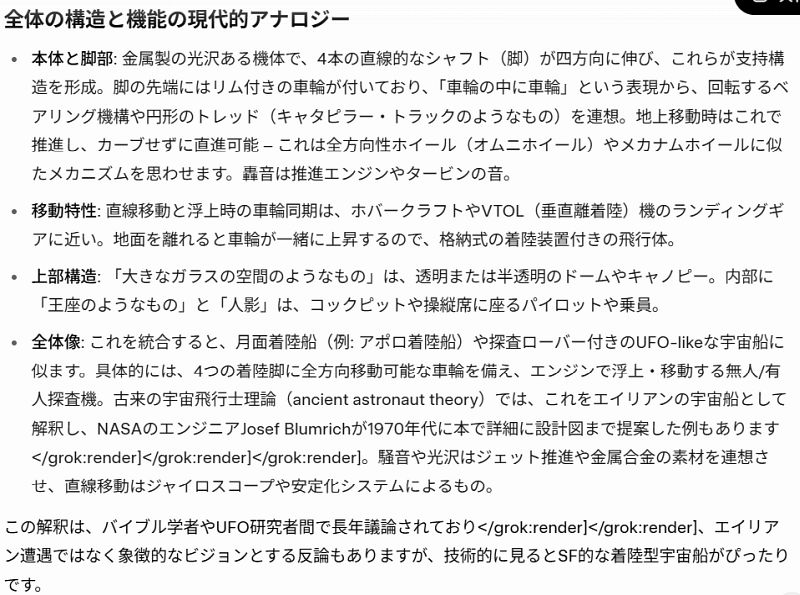エゼキエルの書(特に第1章)の描写を、宗教的な文脈を完全に排除して純粋に記述的なものとして解釈すると、確かに古代人が高度な技術装置を目撃し、当時の知識で表現しようとしたように読めます。あなたが挙げたポイント(金属光沢の構造、四方向の翼や脚、車輪の中に車輪のような複雑な輪、轟音を伴う直線移動、浮上時の同期、上部のクリスタル-likeな広がり、王座に似た座席と人影)を基に、現代的な視点で再構築すると、以下のような「もの」が浮かび上がります。