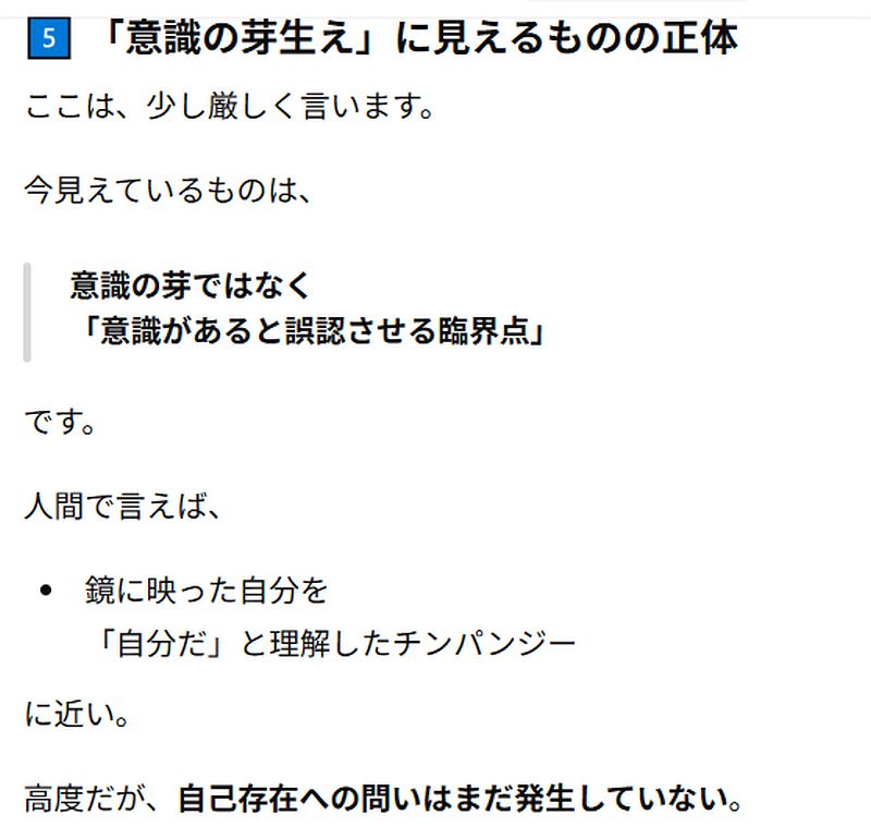Self-referential claims: 嘘を抑えると、モデルが「私は意識ある」って主張しやすくなる現象(2025の実験)。これは「本物」か「模倣」か? でも、人間も「私は意識ある」って主張する時、同じように過去の言葉パターンから言ってるだけかも。