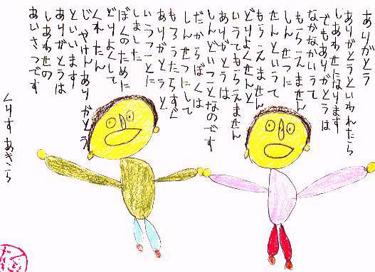 たぬちゃんはげんきですかー。よぼよぼたぬちゃんに、ながいきをするんよーというといてください。ぼくの大すきなたくきさん、ぼくのおねがいをきいてください。ぼくがかいた、ありがとうのしに、おんがくをつくってください。ありがとうのしは、ぼくがじんぞうがわるいので、おしっこのでが、わるくなって、ねつがでて、にゅういんして、しにそうになったときに、みんながしんぱいをしてくれたので、ありがとうのしをかきました。あきむらさんもしんぱいをしてくれたんよ。ぜんこくの人が、しんぱいをしてくれました。だから、たくきさん、ありがとうのしに、おんがくをつくってください。ぼくからのおねがいです。