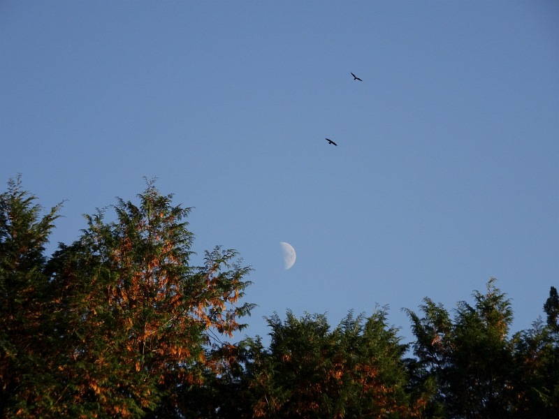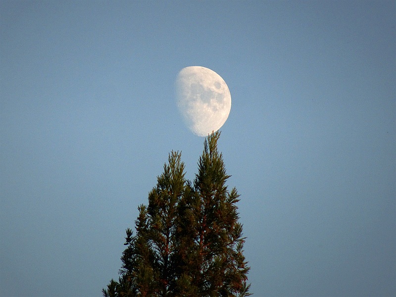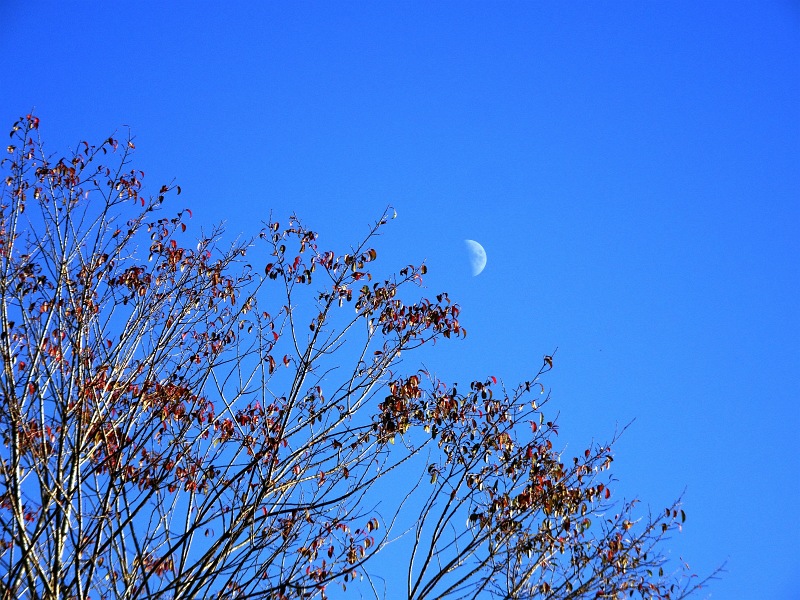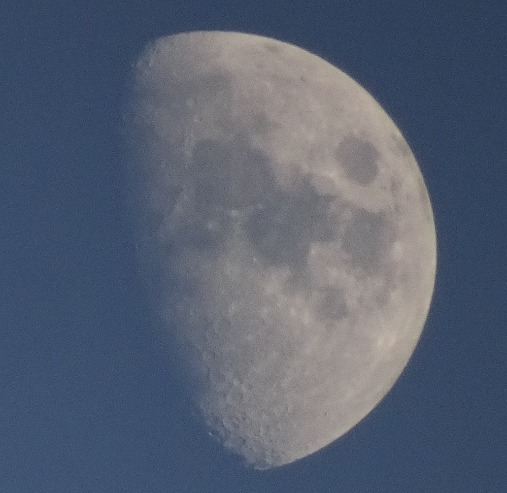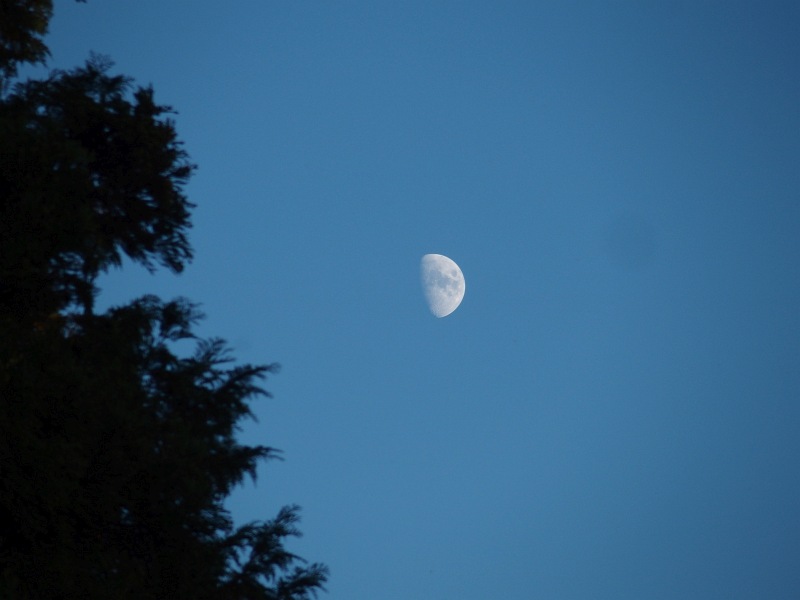 同じ場所・時間で月を広角端と望遠端で撮ってみた写真です。光学ズーム端の倍率が倍以上違うので、同じサイズで比較すると月の大きさがまったく違うのは当然ですが、他には空の色がだいぶ違うのが気になりますね。