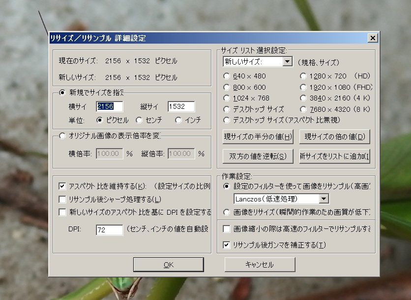 Ctrl+R で画像の解像度(サイズ)変更ダイアログが開きます。