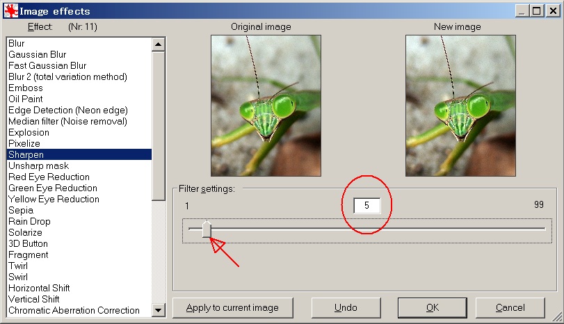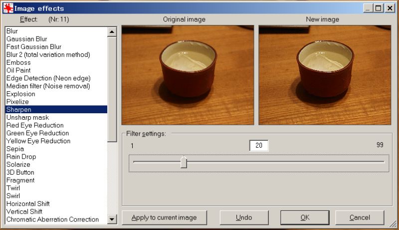 Ctrl+Eで、各種のフィルター類をかけるダイアログが出ます。シャープフィルタもここに入っていますので、最初にシャープフィルタの初期設定値を20から5くらいに下げておきましょう。一旦下げた値は次にIrfanViewを開いたときも保持されています。