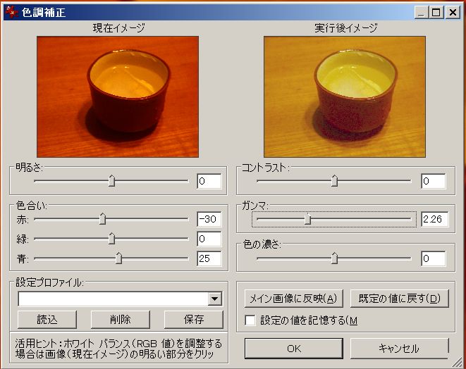 色味の調整はここでできる。「明るさ」はいじらず、明暗は「ガンマ」で調整するのがコツ。