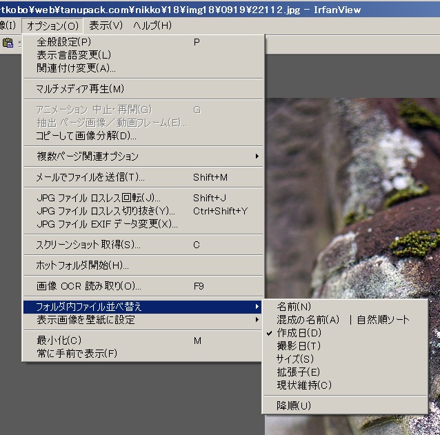 ←→矢印キーで同じフォルダ内にある画像に移動します。ファイルの順番は名前順、更新順など変更できます。