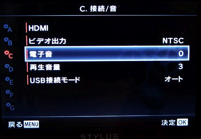XZ-10の場合、音はギアアイコン(カスタムメニュー)の設定に入っています。そこで「電子音」を選び、音量をゼロにします。↓