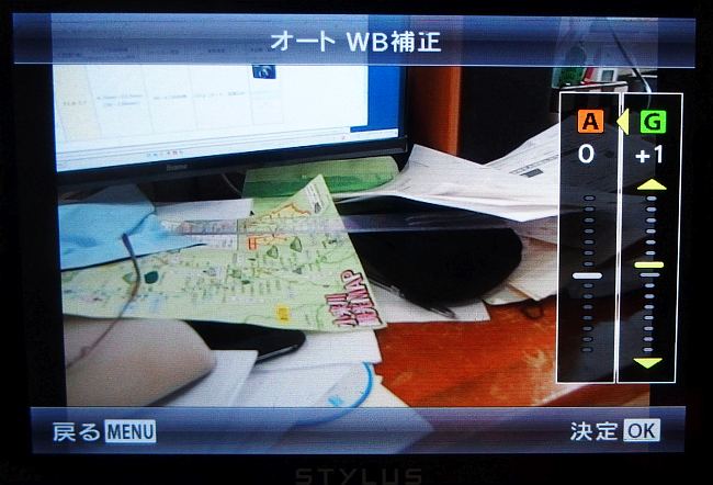 カスタムメニュー⇒画質/WB⇒WBモード で「オート」にした後にさらにサブメニューを出し、A(アンバー=赤味)とG(グリーン)の度合を微調整