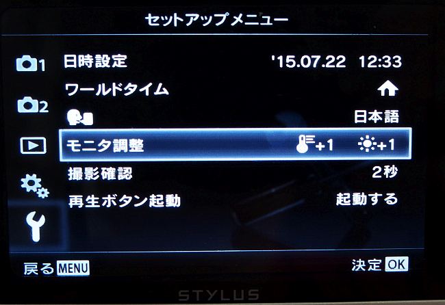 液晶モニターの輝度、明るさ調整です。これをいじっても、晴天下ではやっぱり見えにくいのであんまり意味がないかもしれませんが、一応、ここで調整できるよ……ということで……。