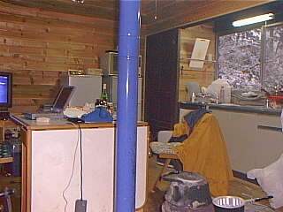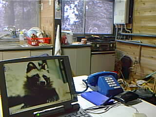![]() | 二階の仕事場があまりに寒いので、居間にあったテーブルを台所に持ち込み、パソコンを置いた。台所は7畳半。この家でいちばん狭い部屋。薪ストーブとガスストーブがあり、暖房は万全。 |