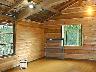 壁は少しずつ自分で板壁に張り替えている。杉板を15坪分くらいずつ注文し(それで数万円。節だらけのいちばん安い板。しかも生乾きなので安い)、パコパコ打ちつけていく。
