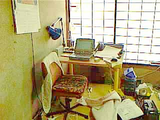 ↑とっちらかった仕事机周辺。この机も自作した。机の上に置いてあるのが、愛機ジロ。
