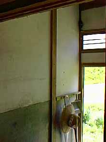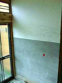 ↑左は改装前の玄関の壁。下半分はコンクリート、上半分が白壁。前の住人の子供が残した悪戯描きがあちこちにある。右側が杉板を張った壁。