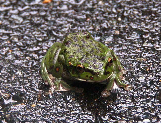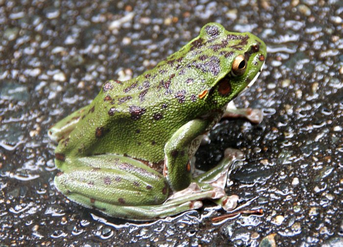 上のモリアオガエル。水の中で自由な格好をしている