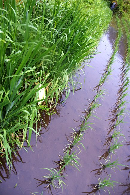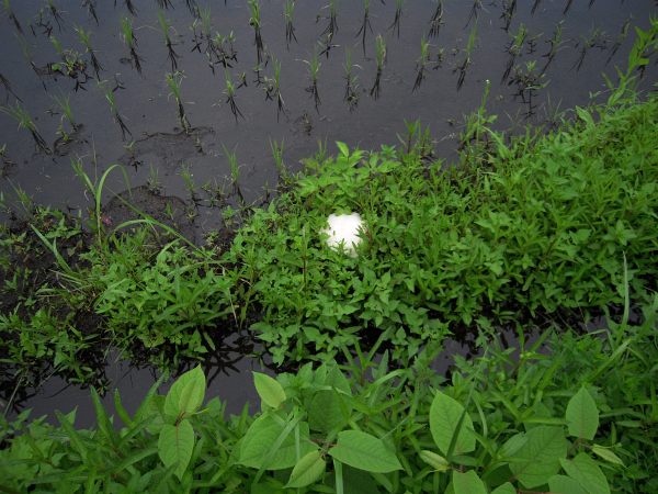 田圃の縁に産みつけられたモリアオガエルの卵塊↑