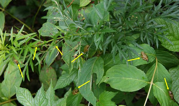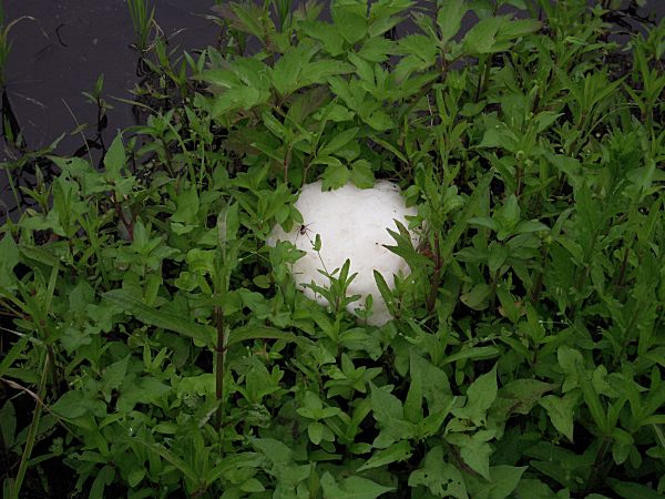 また、止水の上に出ている葉っぱつきの枝という条件は極めてシビアなので、田圃の畦の草むらに絡めるようにして産んだり、池や沼の縁に産みつけている例もある。