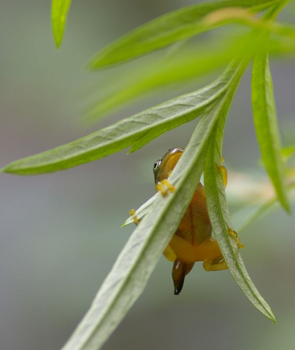 変態直後のモリアオガエルの子は、1日ほど低木の草の上などでぼーっとしている。このときが唯一の撮影チャンスで、この後はすぐに森の奥深くへと移動してしまう。そこから先は、3年後、産卵のために戻ってこない限りはまず目にすることはできない。そのへんが他のカエルとは違うところだ。