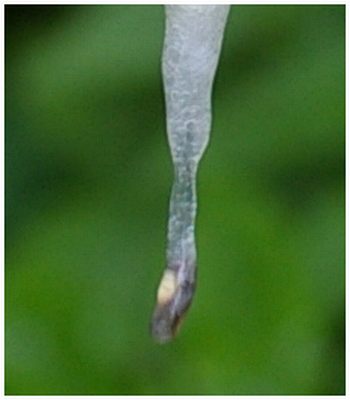 下に止水がある枝に産みつけるのだが、正確には、枝ではなく、枝についた葉っぱに粘着させるようにして産む。枝では接触面積が得られず、すぐに落ちてしまうからだ。