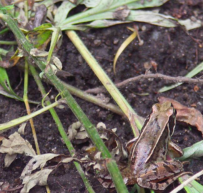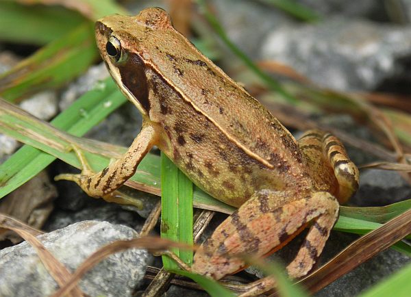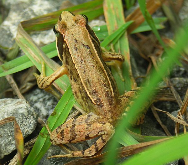 ニホンアカガエルの体色は比較的明るく、側線がまっすぐ↑