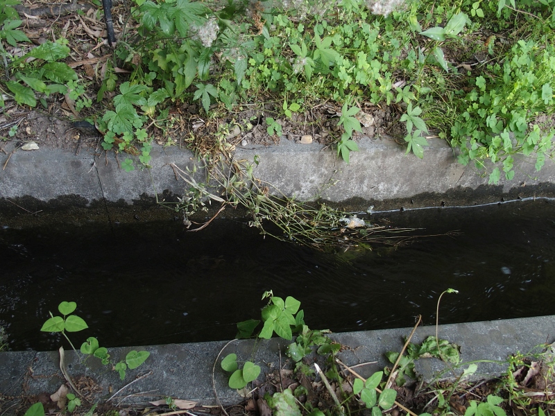 林道脇の水路。このところ雨が降らないので水がほとんどない。どっちにしても完全な止水ではないからオタマには不向き